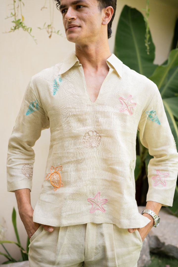 Capture the essence of coastal living with the Beach Coral Shirt from Orange at Eight, expertly crafted in pure linen and adorned with hand-embroidered beach-inspired motifs. This standout piece from our premium vacation wear collection blends artisanal detail with breezy summer comfort.