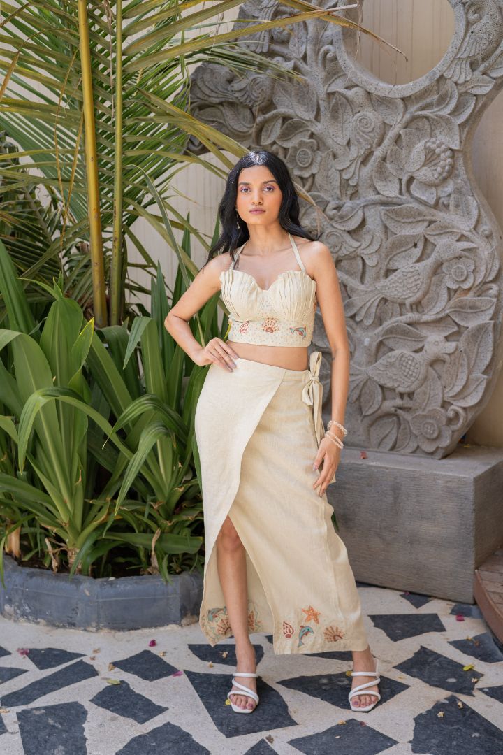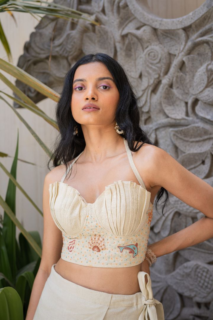 Step into summer with effortless elegance in this shell-inspired top from Orange at Eight. Crafted in pure linen fabric, this premium vacation wear essential features a sculpted sweetheart neckline and structured pleated bust that enhances the silhouette while ensuring breathable comfort.